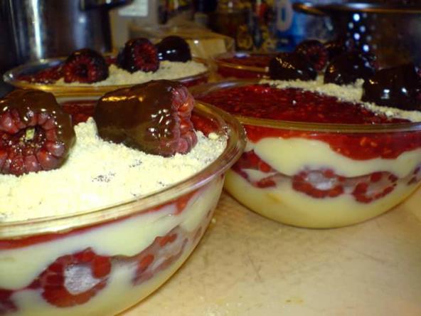 Usuti griz u pripremljene činije, rasporediti svugde jednako. Zatim cele maline močiti u čokoladu i redjati na griz. Preko malina sipati puding, takodje jednako rasporediti u sve činije.