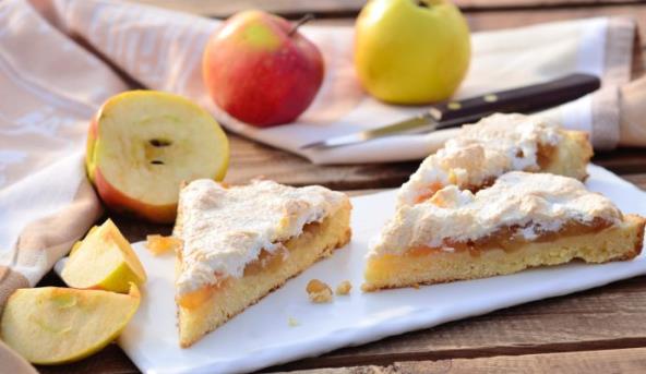 3. Kriške jabuka rasporediti na testo i malo ih pospite cimetom. Izlupati sneg od belanaca, a za nadev izmešati žumanca, šećer i gustin, dodati svež sir, koricu i sok od limuna te na kraju dodati sneg i to preliti preko jabuka.