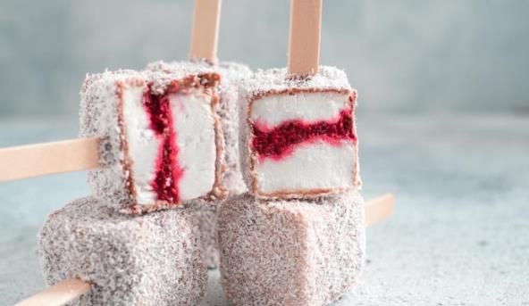 2. Sipajte ga u veliku posudu, prospite po njemu džem od jagode i razvucite čačkalicom, tako da dobijete izgled mermernih šara, pa prebacite u podmazan četvrtasti pleh obložen pek papirom (papir neka obavezno viri izvan pleha za oko 3 cm). Izravnajte i zabodite štapiće odokativno kako ćete kasnije seći kocke. Odložite u zamrzivač i ostavite da stoji preko noći.