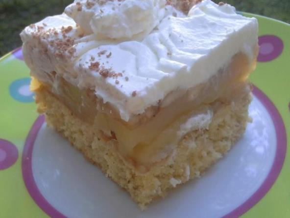 Jabuke oljuštite izrežite na kriške, poprskajte ih sokom od limete, u jednu šerpu stavite vodu, šećer,vanilin šećer i limun šećer. Stavite jabuke i prokuvajte, procedite ih i stavite na pečeni biskvit. U 500 ml tečnosti u kojoj su se kuvale jabuke skuvajte 2 pudinga od vanile i sipajte po jabukama na vruć puding. Složite banane nasečene na kriške, poprskajte ih sokom od limete i ostavite da se kolač ohladi... Tada stavite slatku pavlaku za šlag koje ste izmiksali mikserom. Rasporedite ga po kolaču i ukrasite po želji.