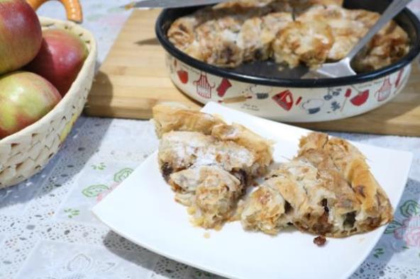 Jabuke oljuštiti i izrendatI, dodati šećer, vanilin šećer, cimet i suvo grožđe. Sve dobro izmešati. Koru raširiti na sto, namazati malo uljem i rasporediti jabuke, saviti malo ivice i uviti.