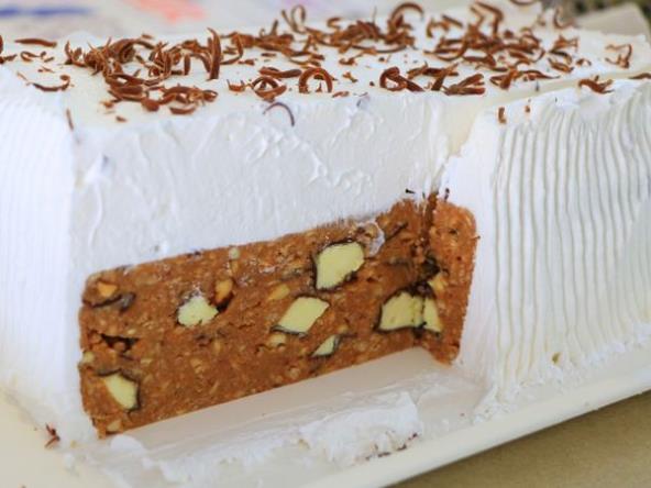Preokrenite tortu na tacnu, skinite foliju, još malo oblikujte i premažite u debelom sloju umućenom slatkom pavlakom ili šlagom. Prijatno.