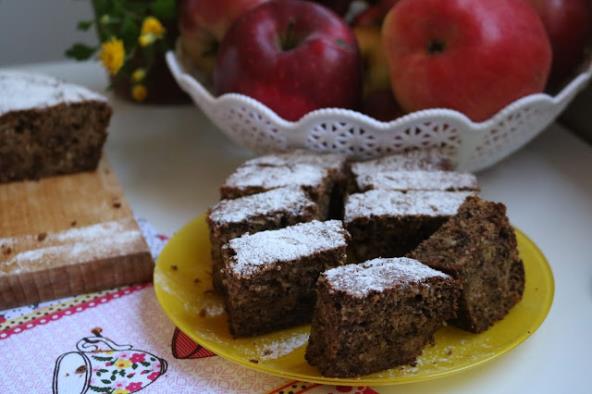 Umutiti jaja dodati sve navedene sastoje pa dobro izjednačiti. Sipati u podmazan peleh i peći na 200 stepeni 40 min. Pečen kolač posuti prah šećerom zamirisan vanilom. Seći kad se prohladi.