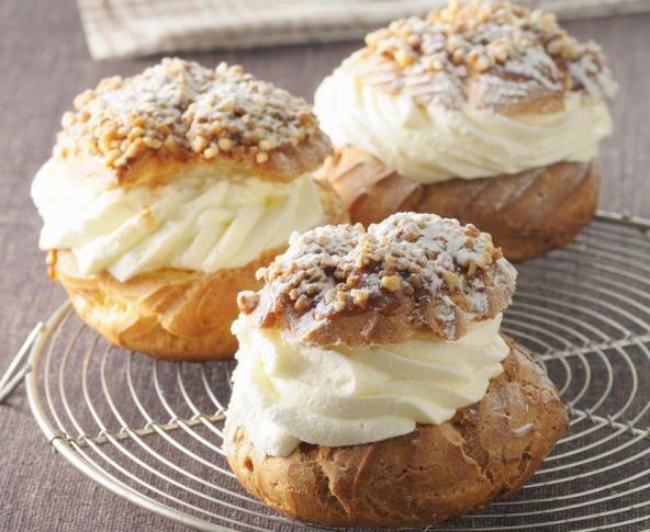 Hladnim krofnicama odseći vrhove, puniti ih kremom, vratiti gore poklopce i posuti šećerom u prahu.