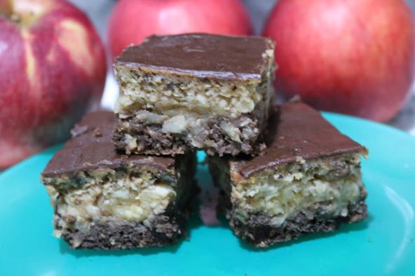 U pleh prvo staviti tamni deo, pa oceđene jabuke i preko svetli deo.