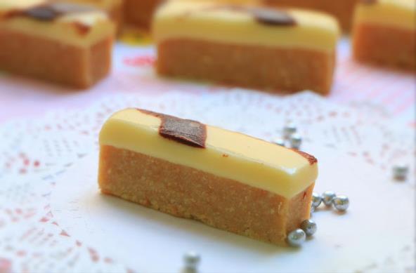 Za drugi deo ušpinujte opet šećer, dodajte margarin i čim se istopi sklonite sa šporeta. Prebacite u vanglu jer je potrebno mutiti mikserom. Dodajte lagano mleko u prahu i mutite par sekundi tj. dok smesa ne postane glatka. Odmah, bez čekanja prelijte preko dela od keksa, razmažite i ostavite da se kolač dobro stegne pa tek onda izrežite.