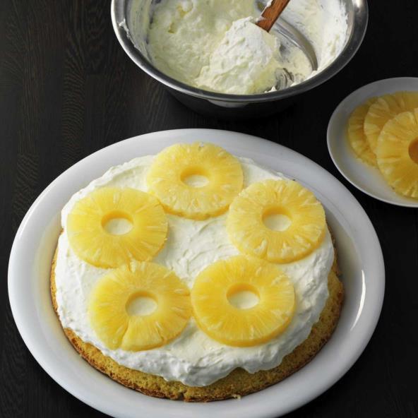 Šlag krem umutiti i dodati 2 kašike u kremu. Pečenu piškotu staviti na kuhinjsku krpu, posuti šećerom i prekriti je mokrom krpom. Kad se piškota ohladi, premazati je kremom. Iseći 4 trake. Prvu traku urolati, staviti na tanjir i ponavljati postupak. Kremom premazati tortu i ukrasti je šlagom. Poređati 4 koluta ananasa i posuti šarenim mrvicama.