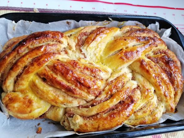 Staviti u podmazan pleh i ostaviti da poraste. Namazati žumancetom. Peći na 200 stepeni C pa smanjiti na 180 stepeni i peći 35-40 min.