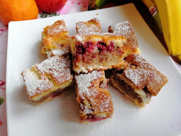 Podmazati pleh uljem pa ga posuti brašnom. Sipati pola testa pa po nejemu pola malina pa rendane jabuke pa opet maline i ostatak testa, Peći na 200 stepeni oko 40-50 min. Seći kad se prohladi..