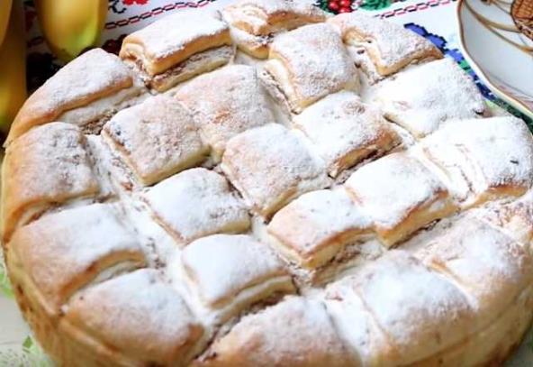 Razviti i drugu koru i prebaciti preko nje, premazati je uljem i namazati džemom i posuti orasima. Tako do kraja. Na kraju idu dve prazne kore samo premazane uljem.