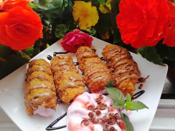 Jaja izlupati, dodati kašiku brašna, prašak za pecivo i šećer u prahu i sve dobro žicom izjednačiti. Banane uvaljati u brašno, jaja i kokos. Pržiti u vrućem dubokom ulju dok ne porumene. Vaditi na salvete. Banane preliti u tankim mlazu medom i rastopljenom čokoladom. Servirati uz kuglu sladoleda. Uživajte!