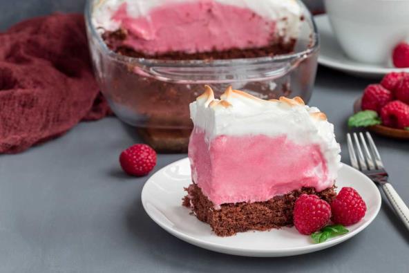 U drugi deo dodajte maline, pa izlijte na prvu smesu, a u trećem delu ostavite samo šlag.