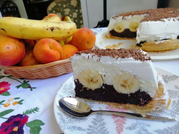 U pečen kalup sipati čokoladni deo pa poređati cele banane, odozgo svetli puding i lepo izravnati.