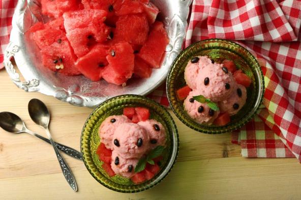 1 kg lubenice težine zajedno sa korom. Samo crveni deo lubenice iseći na manje kockice i očistiti od semenki, izmiksati da se dobije čist sok. (potrebna je količina koliko piše na kesici za šlag, tj. oko 250 ml soka za dve kesice šlaga koji se muti sa vodom).