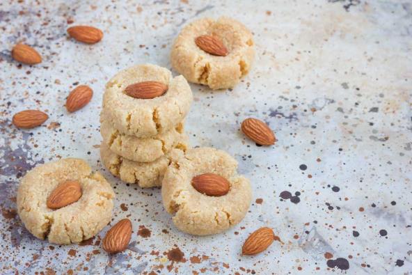 Zagrejte rernu na 180°C. U manjoj činiji pomešajte suve sastojke - brašno, so i prašak za pecivo. U većoj činiji dobro izmiksajte maslac i šećer. Zatim dodajte sve pripremljene suve sastojke, ekstrakt vanile i naposletku, tahini. Sve dobro izmešajte. Pripremite pleh i obložite ga pek papirom. Od testa pravite omanje loptice, ili koristite pola kašike testa za svaki kolačić. Kuglicu blago pritisnite i stavite badem u sredinu ili pospite susamovim semenom. Pecite 14-15 minuta u prethodno zagrejanoj rerni.
