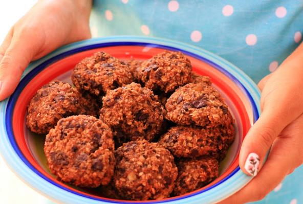 Izgnječiti banane pa im dodati iseckanu čokoladu, ovsene pahuljice, med, kikiriki puter. Dobro sjediniti pa rukama praviti male kolačiće. Peći oko 15 minuta, pazite da ne prepečete. Mogu se odmah jesti i čuvati u zatvorenoj posudi. Uživajte u slatkom koje ima manje kalorija.