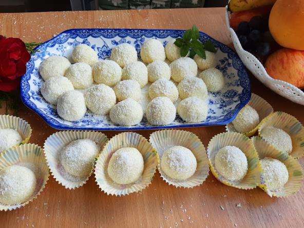 Ostaviti da se potpuno ohladi i vaditi kašičicom. Staviti u sredinu čokoladnu kuglicu, praviti kuglice i uvaljati u kokos. Ostaviti još u frižider da se stegne.