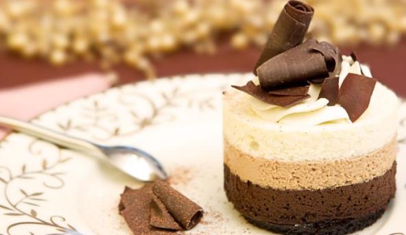 3. Za tamni mus potopiti želatin u malo vode. Iseckati čokoladu i otopiti je na pari. Na pari umutiti jaje sa 2 kašike vode. Dodati želatin, espreso i čokoladu, pa ohladiti. Čvrsto ulupati slatku pavlaku i dodati je čokoladi. Mus sipati u kalup. Ostaviti da se stegne u frižideru.