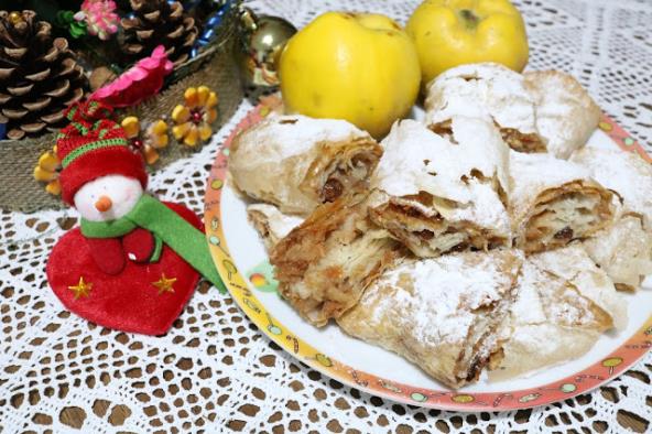 Saviti krajeve i uviti u rolnicu i staviti u podmazan pleh. Tako sve do utroška materijala. Premazati uljem i peći na 200°C oko 34 min. da lepo porumeni. Posuti prah šećerom i kesicom vanilin šećera. Seći i sladiti se.