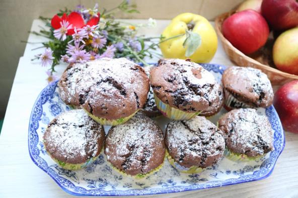 Umutiti jaja pa dodati sve navedene sastojke, lepo izjednačiti. Razliti u mafin kalupe u koje smo stavili papirne korpice. Peći na 200 stepeni 40 min. Možete posuti prah šećerom.
