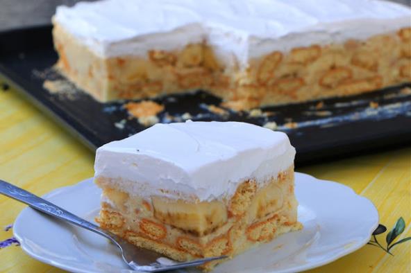 Poređajte polovine banana jednu pored druge pa prekrijte drugim delom fila. Ostavite da se stegne, premažite šlagom i ukrasite po želji.