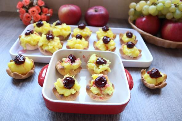 Izvaditi papirne kalupe a u korpice ubaciti kuvan puding i na vrh pudinga ubaciti voće po želji.