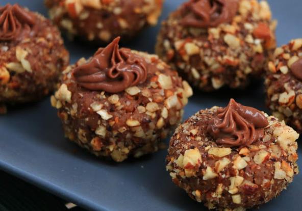 Izmešati u predhodno rastopljenoj smesi i ostaviti da se ohladi. Praviti kuglice i uvaljati u krupno iseckan, pečeni lešnik. Na sredini napraviti udubljenje. Da se uvaljaju potrebno je još 150 g lešnika ( ne potroši se sve).