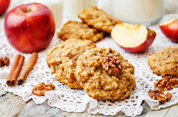 Suve sastojke pomešajte (brašno, cimet, oraščići, prašak za pecivo i so). Maslac sobne temperature mutite sa šećerom i medom minut, pa ubacite jaje i vanilu i nastavite da mutite još minut. Dodajte suve sastojke i sjednite mikserom. Na kraju špatulom lagano dodajte narendane jabuke, a nakon toga i zobene pahuljice. Bilo bi dobro da smesa odmori u frižideru pola sata, ali ako nemate vremena biće odlični i bez stajanja u frižideru. Upalite pećnicu na 175°C i obložite jedan pleh pek papirom. Kašičicom uzimajte komadiće testa, veličine oraha i slažite na pleh. Pecite 15-20 min, dok ne dobiju lepu smeđe zlatnu boju.