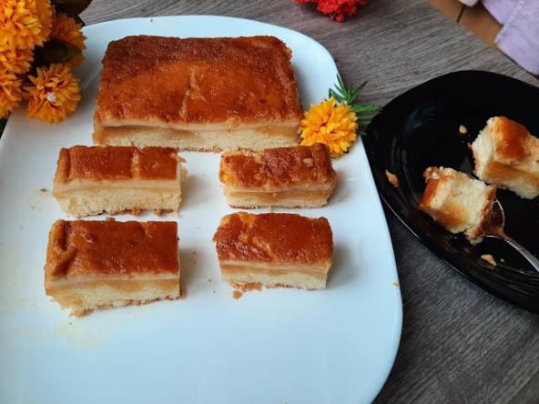 Umutiti 2 jaja sa 100 g šečera pa dodati brašno, dobro izjednačiti može i malo praška za pecivo. Jednako prelivati mleko u tepsiju. Pleh staviti u drugi malo veći i u njega sipati za pola cm vruće vode.