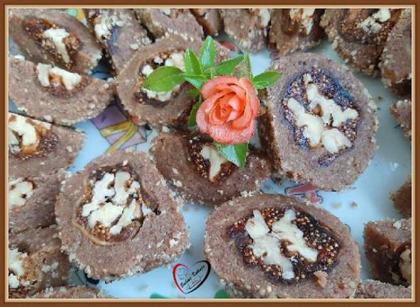 Ušpinovati šećer sa vodom, pa dodati margarin i čokoladu i kad se istope dodati mlevene orahe i keks. Dobro izmešati i ostaviti da se ohladi 2 sata u frižideru. Na svakoj smokvi odseći petiljku i malo je zaseći i napuniti sa jezgrom oraha. U dlan staviti kašiku oraha i u sredinu staviti smokvu i napraviti lopticu. Uvaljati po želji u mlevene orahe. Ohladiti u frižideru par sati pa seći oštrim nožem na polovinu ili četvrtinu.