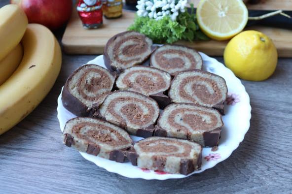 Ušpinovati šećer, pa dodati mlevene orahe, pa podeliti na pola. Jedna polovina ostaje bela i nju rastanjiti na foliju oko pola cm. Premazati sa sokom od limuna. U drugu polovinu dodati 50 g otopljene čokolade, pa rastanjiti i staviti na beli deo. Uviti u rolat i preliti čokoladom. Ostaviti da se ohladi i seći.