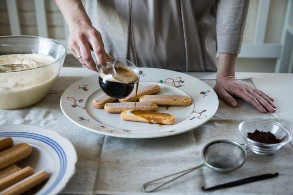 Piškote prepolovite na pola, umočite u kafu i stavite u čašu.