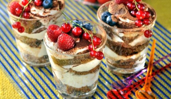 2. Na dna šest caša pore ati sloj medenjaka, pa poprskati polovinom mešavine od espresa. Pore đati pola voća, pa prekriti slojem krema. Ponoviti i završiti kremom.