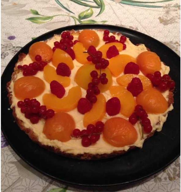 Pomešati sve sastojke i napraviti glatko testo. Zatim ga ispecite da porumeni (u okrugloj tepsiji prečnika 30cm – dva tarta). Umutite žumance i šećer, pa dodajte brašno i mleko i kuvajte na pari. Kada se ohladi sipati na testo skuvan žuti fil, poređati odozgo voće i na kraju, pred služenje, slatka pavlaka.