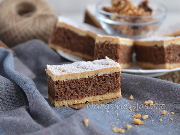 Brašno pomešajte sa praškom za pecivo. U veću posudu sipajte pripremljeno brašno, maslac ili margarin sobne temperature, jaje i šećer. Izmesite testo. Podelite ga na dva jednaka dela i od svakog napravite lopticu. Tepsiju dimenzija 20x35 cm nauljite i pobrašnite. Na pek papir stavite testo, zatim stavite drugi pek papir i razvaljajte ga na dimenzije tepsije. Povremeno nakon što odvojite gornji pek papir, testo možete potiskivati lenjirom da dobijete ravnije rubove. Oklagijom testo zarolajte i prebacite ga u tepsiju. Ukoliko je potrebno rubove u tepsiji malo pritisnite prstima. Za nadev izmiksajte belanca u čvrsti sneg. Posebno izmiksajte žumanca sa šećerom, tako da postanu penasti. Dodajte istopljenu čokoladu i brašno, zatim kratko izradite mikserom. Dodajte pripremljena belanca i kratko promešajte varjačom. Nakon što dodate mlevene orahe, sve sjedinite varjačom. Pripremljenu smesu rasporedite u tepsiji preko testa. Drugi deo testa razvaljajte na način kao prvo testo i prebacite ga u tepsiju preko nadeva. Ukoliko vam je deo testa ostao priljubljen uz stranice tepsije, odrežite ga. Viljuškom izbockajte površinu testa. Kolač stavite da se peče u zagrejanoj rerni na 180°C 30-35 minuta. Ostavite ga da se ohladi. Pre služenja kolač posipte šećerom u prahu.