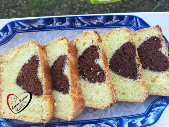 Peći na 200°C u plehu 22x10 cm oko 35-40 min. Probati ćačkalicom da li je pečeno. Dok se biskvit hladi umutiti svetli deo isto samo se ne dodaje kakao. Ohlađen tamni biskvit iseći na debljinu od 1,5-2 cm, pa vaditi kalupom srca ili već neke druge figure koje imate. U dnu kalupa sipati 3 kašike testa, pa poređati isečene figure (ja sam srca) jedna do druge, a odozgo sipati svetli deo. Vratiti u rernu i peći na 200°C oko 35--40 min. Pečen kolač ohladiti i posuti prah šećerom ili preliti čokoladom.