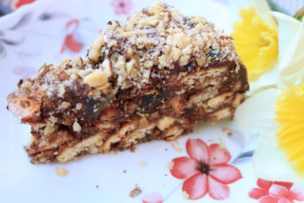 U šerpi istopiti margarin, dodati med i čokoladu. U polomljen keks dodati seckane orahe, sok i istopljenu čokoladu. Može se dodati i ekstrat ruma po želj. Sve dobro izmešati i sipati u pleh koji ste obložili folijom. Dobro kašikom pritisnuti.