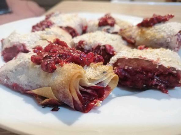 Rasprostite prvu koru, pa je premažite sa malo vode i ulja, zatim sa drugom korom uradite isto, a preko treće sipajte maline i malo šećera i griza, pa uvijte. Postupak ponovite dok ne utrošite materijal. Zatim stavite u rernu na 180°C oko pola sata.