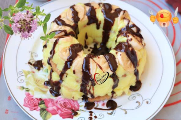 Skuvati puding. Kalup obložiti folijom pa na dno staviti na krugove banane, preko staviti nekoliko kašika pudinga.