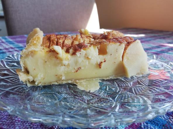 Jabuke oljuštite i isecite na polovine, a zatim te polovine isecite natanke šnite. Zatim jabuke poređajte preko testa, koje ste prethodno razvukli na dimenziju pleha.