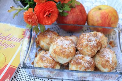Vaditi kuglice, rastanjiti na dlanu ubaciti kockice očišćenih jabuka sa cimetom i malo suvog grožđa.