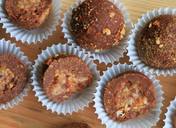 Za prvi sloj takođe sve izmešajte, zamesite rukom i napravite veće kuglice od predhodnih pa stavite kratko u frižider. Rukom svaku pritisnite da se spljošti, na sredinu stavite punjenje, uvaljajte da dobijete kuglicu, ako želite obložite još mlevenim orasima ili lešnicimai ostavite kratko u frižideru. Kuglice možete seći na pola.