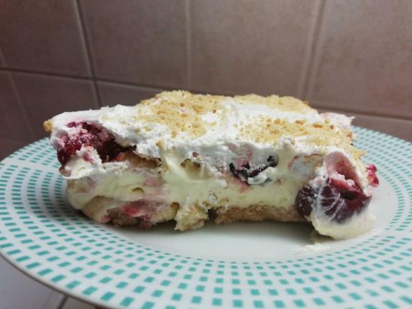 Poređati piškote i preliti ih mlekom da upiju i omekšaju. Umutiti mikserom pavlake sa šlagom od vanile dok smesa ne postane kremasta. Prekriti piškote kremom, poređati voće, posuti sa malo keksa, preko toga preliti beli šlag. Na samom kraju posuti mlevenim keksom. Ostaviti par sati da se stegne u frižideru i služiti.