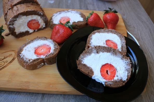 Umutite belanca, pa dodajte prosejano brašno sa praškom za pecivo i kakao. Zatim sipajte vanilin šećer, mleko, ulje, žumanca i sve sjedinite varjačom. Razlijte u pleh koji ste obložili pek papirom i protresite da se izjednači. Pecite na 190°C 15-20 min. Izvadite na krpu, sklonite pek papir u uvite rolat u krpu. Ostavite da se prohladi. Umutite slatku pavlaku, pa ubacite želatin po upustvu na kesici. Sve sjediniti. Prohlađen rolat razviti i premazati umućenom slatkom pavlakom. U donji deo poređati očišćene i oprane jagode i uviti rolat u foliju i krpu, pa ostavite par sati u frižideru.