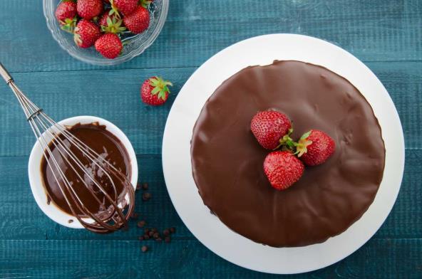 Napravite čokoladni mus: U maloj činiji pomešajte želatin i vodu i neka odstoji 5 do 10 minuta. U međuvremenu, čokoladu usitnite maksimalno da bi se lakše otopila i stavite u posudu otpornu na toplotu. U malu šerpu sipajte 1 šolju slatke pavlake i želatin i neka provri na srednje jakoj vatri. Mešajte dok se ne sjedini. Zatim sipajte preko čokolade i mešajte dok se čokolada skroz ne otopi. Ostavite da se čokolada ohladi, povremeno mešajući. U drugoj posudi umutite prostale dve šolje slatke pavlake zajedno sa šećerom u prahu. Polako dodajte šlag u otopljenu čokoladu i mešajte dok se ne sjedini. Preko kore namažite tanki sloj musa. Presecite na pola onoliko jagoda koliko je potrebno da poređate po unutrašnoj ivici tepsije, a zatim stavite cele jagode iznutra. Deo musa sipajte u kesu za zamrzivač kojoj ste odsekli vrh i popunite sve praznine između jagoda, a zatim mus rasporedite po celoj tepsiji i poravnajte. Stavite u frižider da se ohladi nekih 4-6 sati.