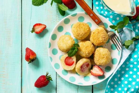 U posudu sipajte mleko i jaje, pa umutite ručnom mutilicom. Dodajte puter, vanilu, badem, šećer i koru od limuna. Opet sve lepo umutite ručnom mutilicom. Zatim dodajte prosejano brašno, so i prašak za pecivo. Umutite testo ručnom mutilicom. Zatim uzmite štapiće za ražnjiće i nabodite jagode na svaki. Lepo obložite jagodu testom i stavite u šerpu sa dosta ulja. Pržite kratko, izvadite i stavite na ubrus, pa sklonite sa ražnjića.