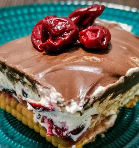 Priprema: Umutite slatku pavlaku i šećer dok ne dobijete šlag. Umačite keks u mleko (po tri keksa). Dobro natopite. Ređajte keks u vatrostalnu posudu. Preko toga dodajte višnje. Ravnomerno rasporedite i preko toga razmažite šlag koji ste umutili. Preostalu pavlaku zagrejati i u njoj istopiti ili čokoladu ili kakao. (ko šta voli) Ohladiti malo krem i prelijte preko kolača.