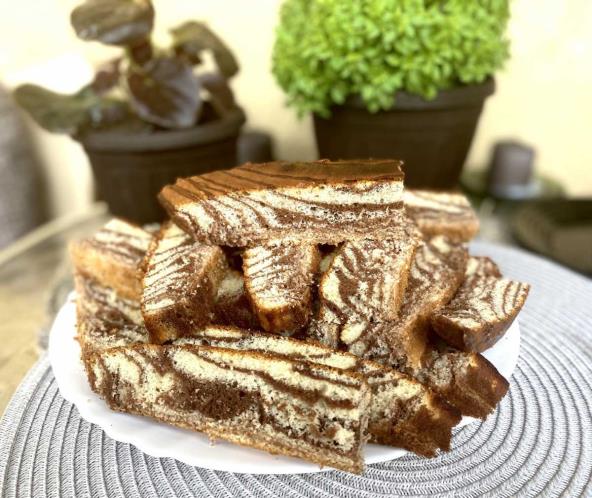 Umutite jaja, pa dodajte vanilin i običan šećer. Nastavite da mutite, pa sipajte jogurt i ulje. Kada to umutite dodajte prašak za pecivo i brašno. Sve lepo sjedinite. Smesu podelite na dva dela. U jedan deo stavite kakao i kašiku mleka. Zatim lepo umutite, da postane glatko. Dve dobijene smese naizmenično sipajte u podmazan kalup praveći krugove. Pecite na 180°C 35 minuta. Prijatno!