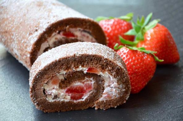 3. Rolat namazati sa filom, rasporediti komadiće jagoda i ponovo smotati. Hladiti oko 3 sata. Ukrasiti jagodama i ljuspama od čokolade.
