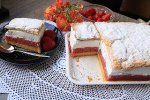 Žutu koru premazati sa voćnim delom jagode, preko jagoda staviti umućen šlag (možete ostaviti malo da se premažu stranice. )Preko šlaga ide svetla kora. Preko svetle kore možete posutu prah šećer. Kolač mora prenoćiti da dobro upije.